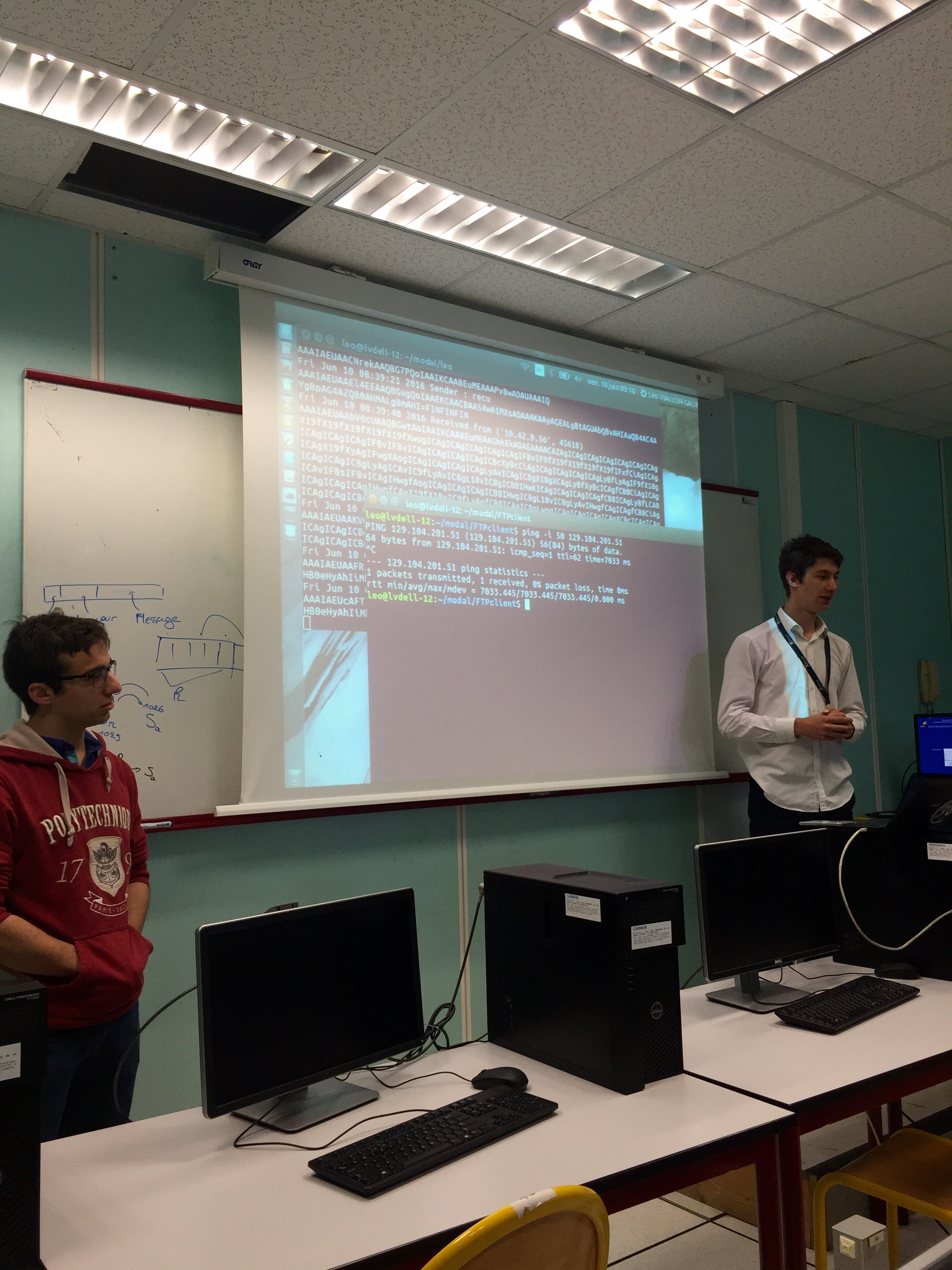 Polytechnique students Leo Viallon & Antoine Colin presenting their MODAL project: IP-over SMS. Why? Because small MTUs and long propagation delays mare for a fun challenge.